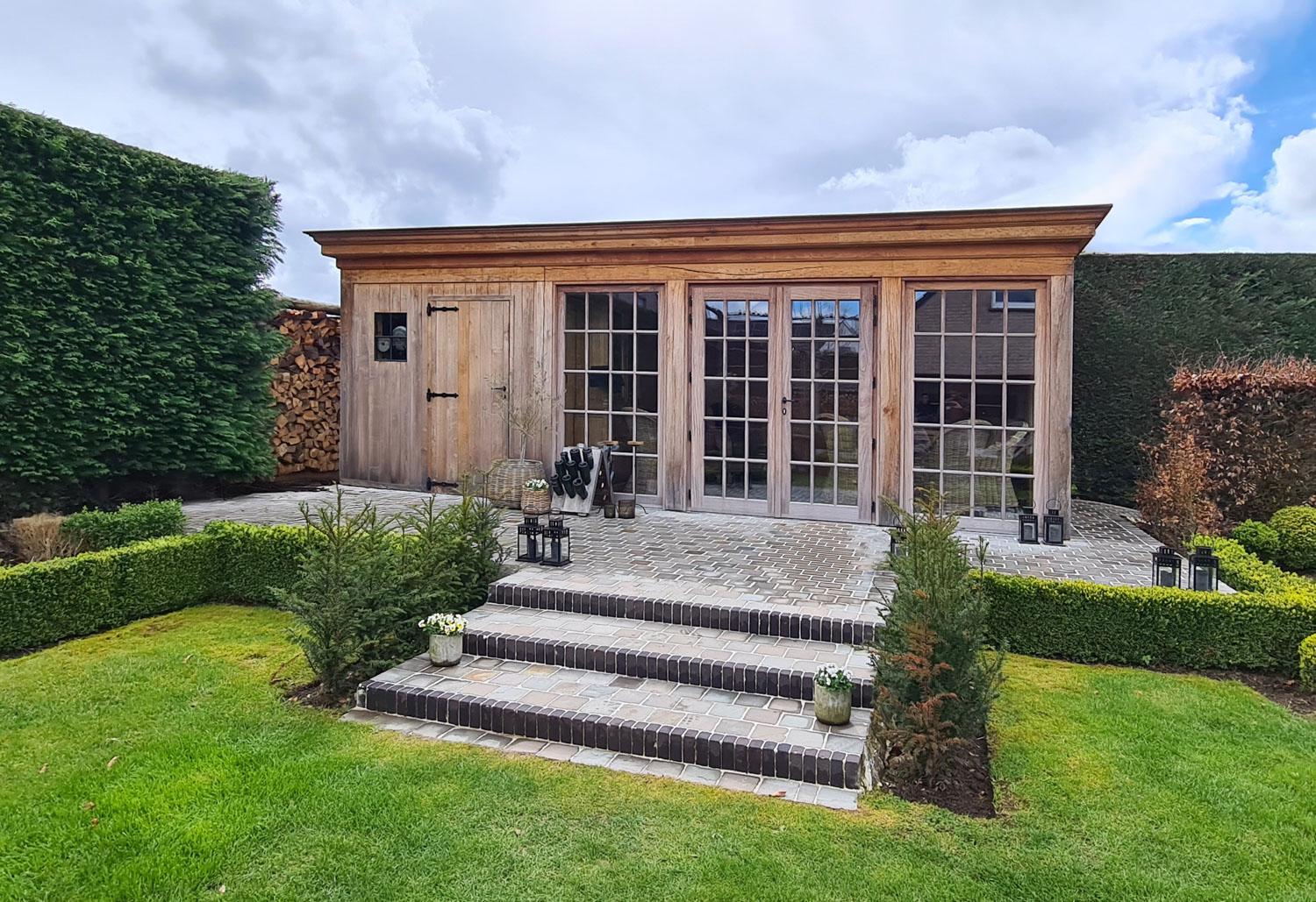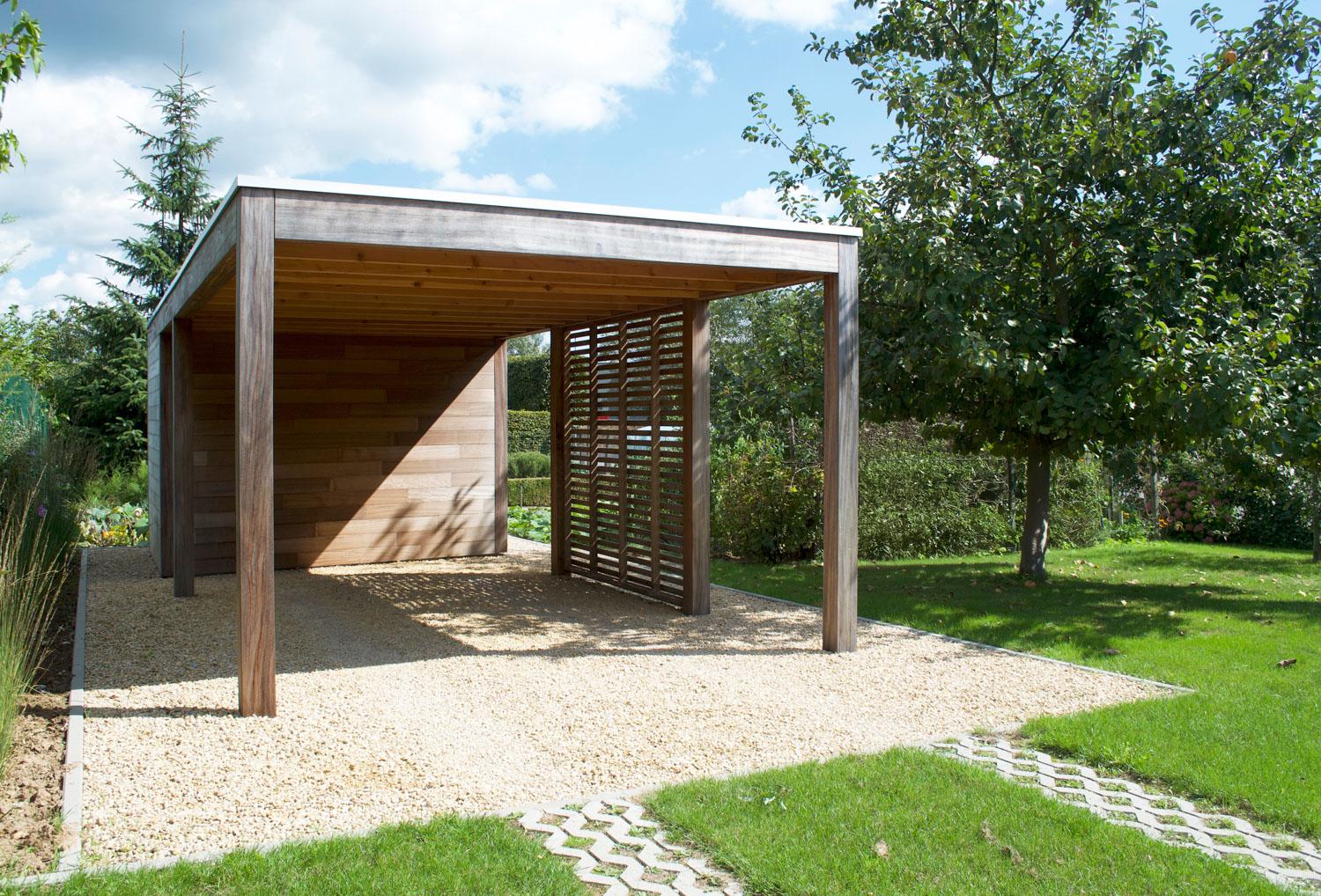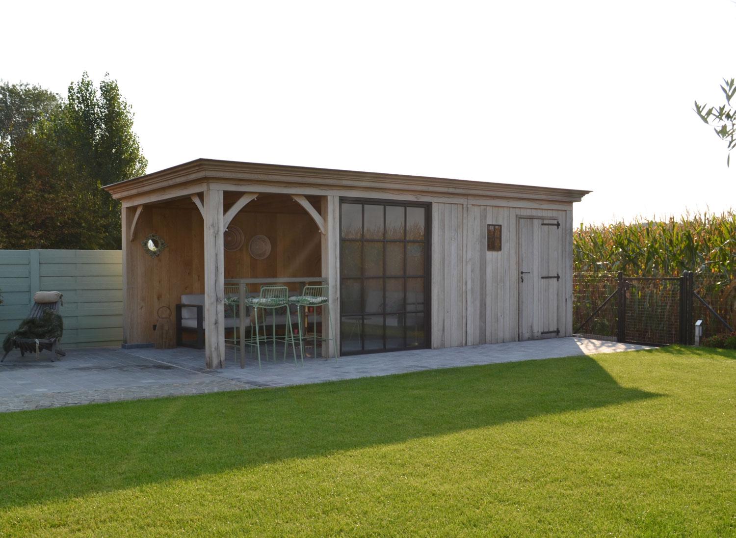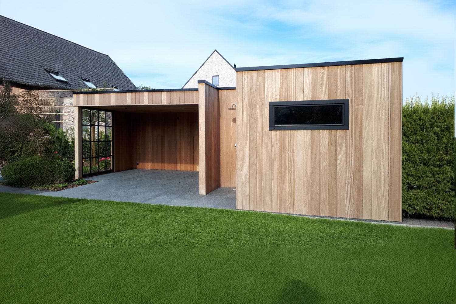 Bijgebouwen op maat. Buitenruimte, terrasoverdekking met berging en een terras in composiet