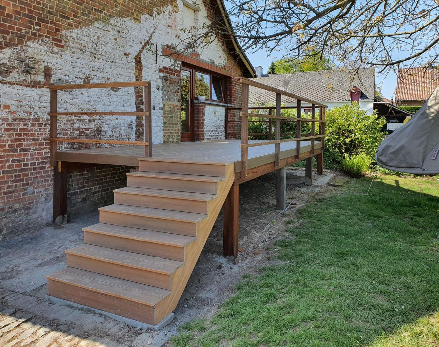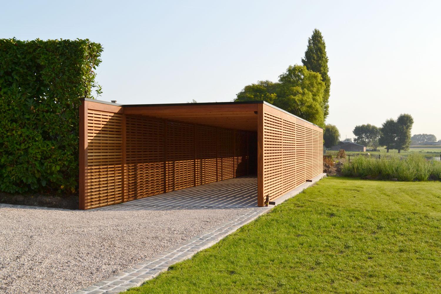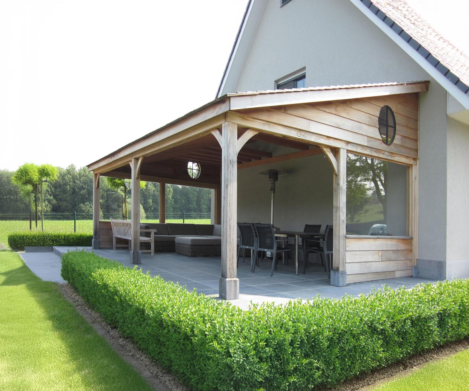 Bijgebouwen op maat. Buitenruimte, terrasoverdekking met berging en een terras in composiet