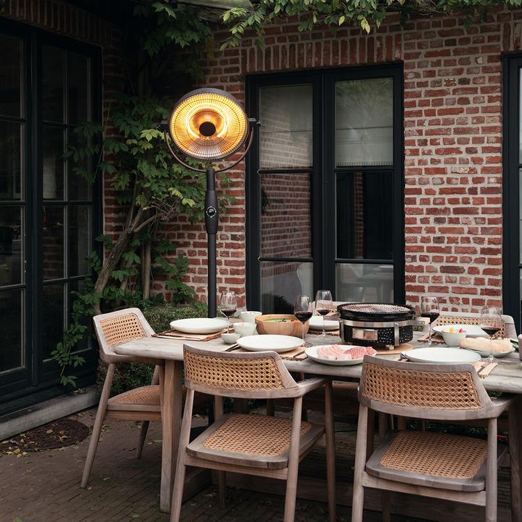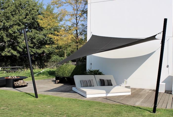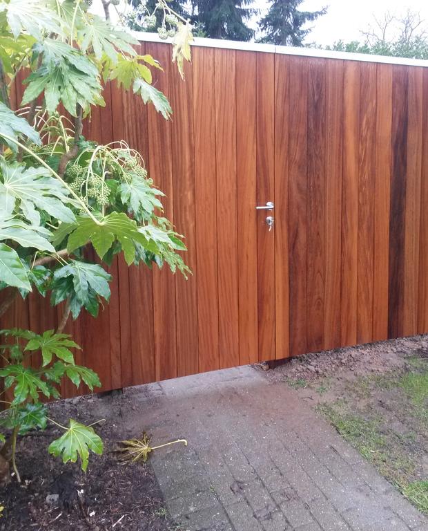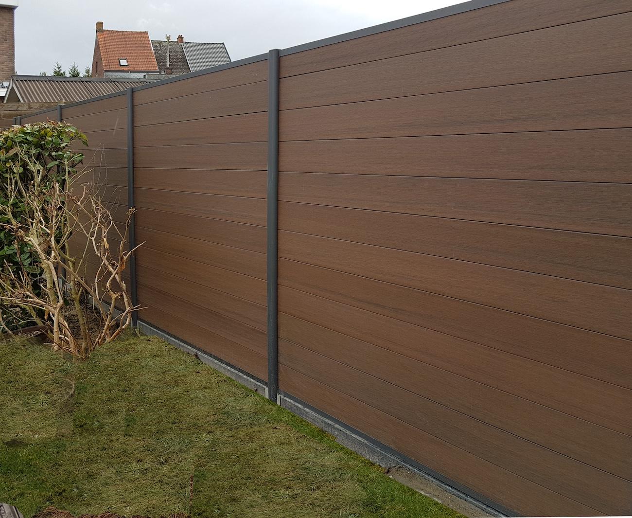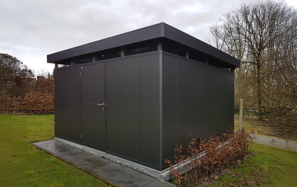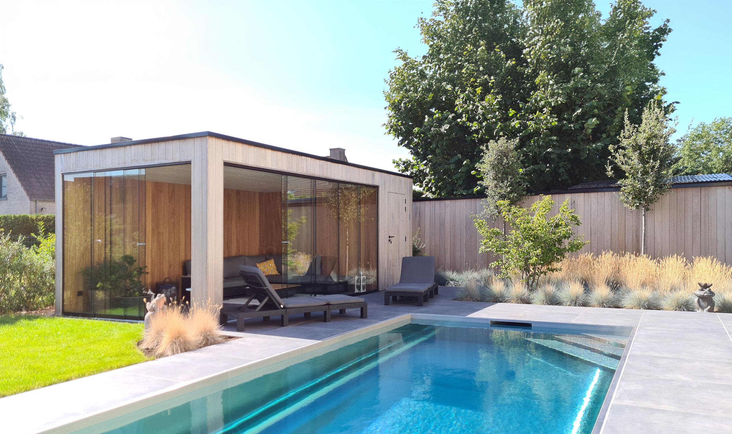 Bijgebouwen op maat. Buitenruimte, terrasoverdekking met berging en een terras in composiet